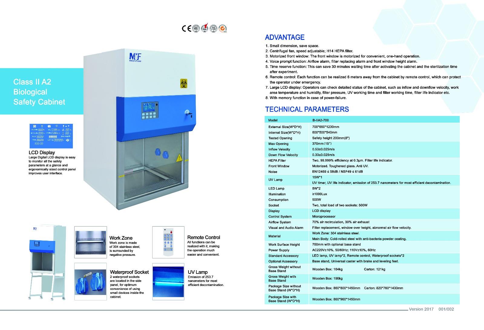 LCD display: exhaust filter and downflow filter pressure, filter and UV lamp working time, inflow and downflow velocity, filter life, humidity and temperature, system working time etc. |